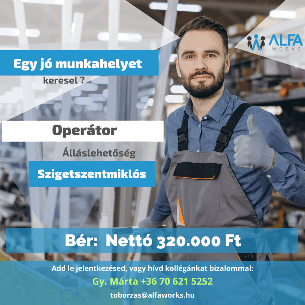 Szigetszentmiklósra keresünk partnerünk számára operátor kollégákat. Amennyiben dolgoztál már gyártásban, igényes vagy a munkádra, rendszerető vagy, ezt a lehetőséget kár lenne kihagynod! Rengeteg tapasztalatot lehet szerezni és karriert építeni egy ilyen biztos helyen. Stabil háttér, biztos munka, hosszútávon lehet tervezni. Mi is számítunk rád!