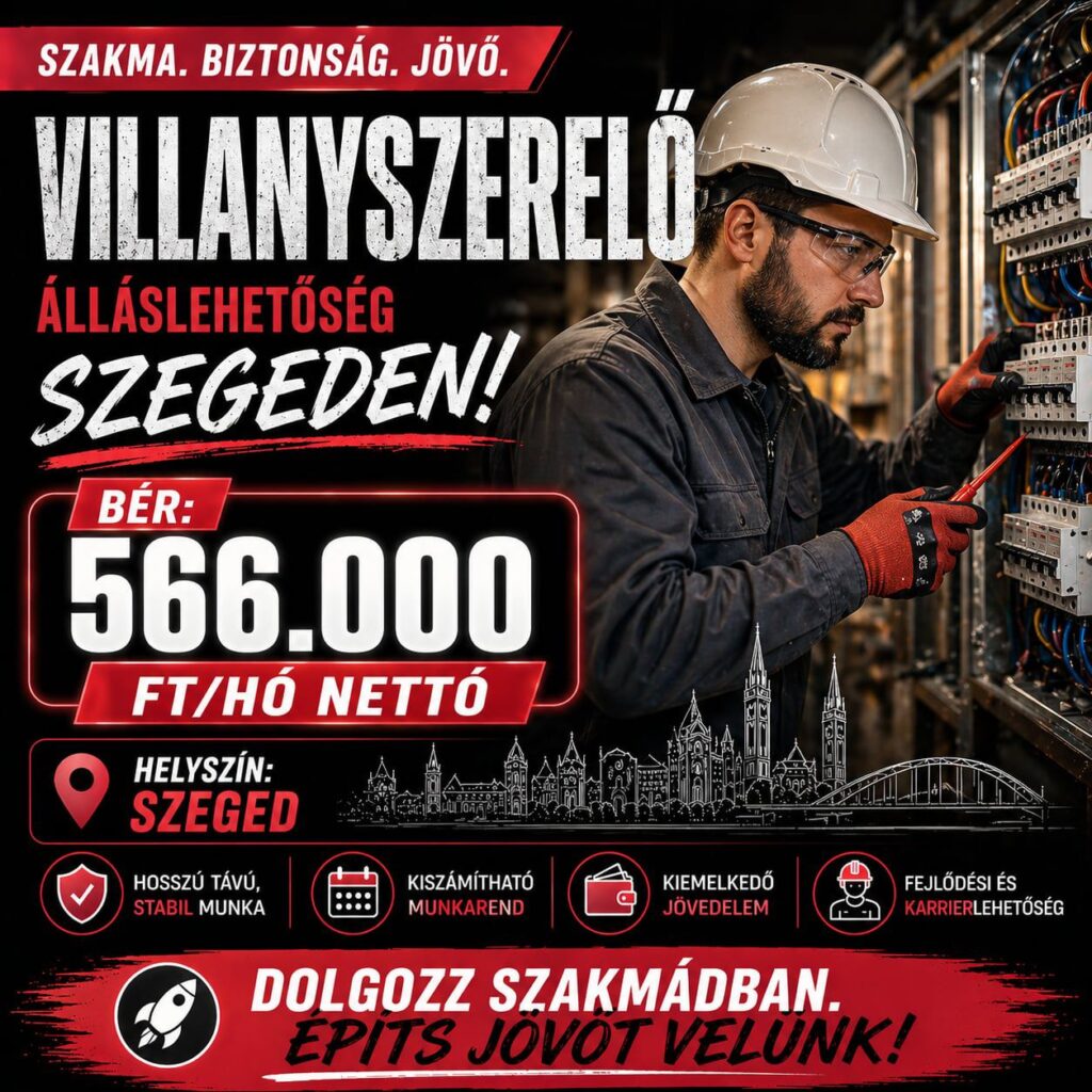 Villanyszerelő pozícióba keresünk elhivatott munkatársakat. Vonzó feltételek, biztos háttér és megbecsülés vár – jelentkezz most, és lépj velünk egy biztosabb jövő felé!